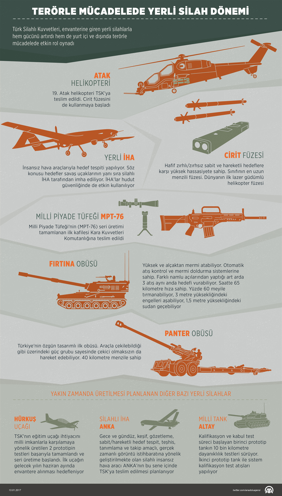 NATO'nun en büyük ikinci ordusu olma özelliğini taşıyan Türk Silahlı Kuvvetleri, envanterine giren yerli silahlarla hem gücünü hem de yurt içi ve dışında terörle mücadeledeki etkinliğini artırdı. ( Murat Usubaliev - Anadolu Ajansı )