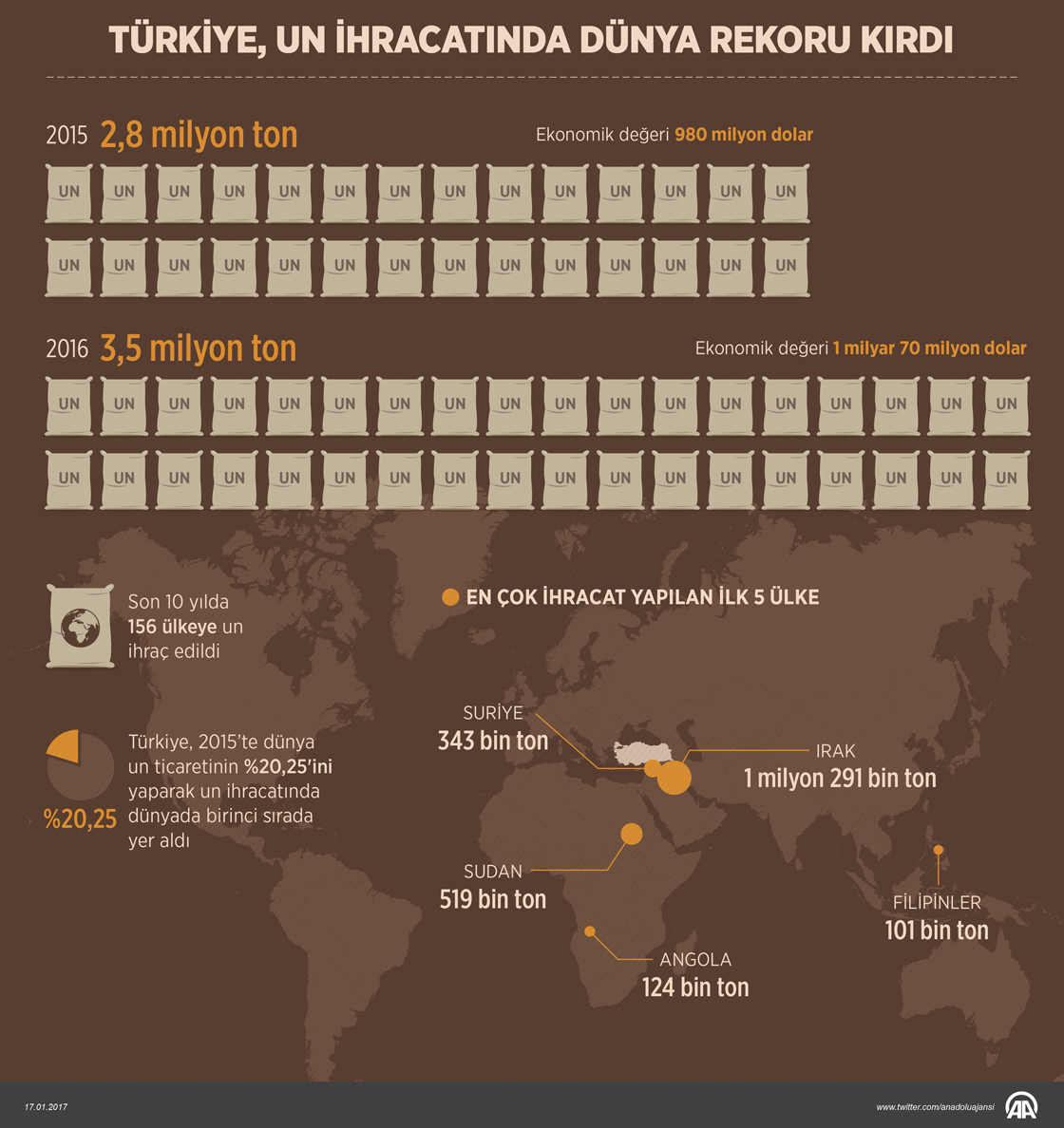 Türkiye Un Sanayicileri Federasyonu (TUSAF) Başkanı Eren Günhan Ulusoy, Türkiye'nin, 2004'te 300 bin ton un ihraç ederken, geçen yıl 3,5 milyon ton un ihraç ettiğini belirterek, "Bu tam 1 milyar 70 milyon dolarlık ihracat demek. 2015'e göre miktar bazında yüzde 25, değer bazında ise yüzde 10 artış var. Bu ihracat rakamları dünya rekoru." dedi. ( Yasin Demirci - Anadolu Ajansı )17 Ocak 2017•Güncelleme: 17 Ocak 2017