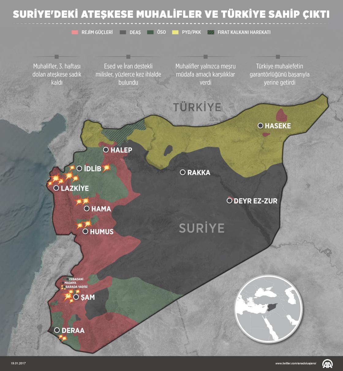 Suriye'de 30 Aralık'ta yürürlüğe giren ateşkes, Beşşar Esed ordusu ve rejim yanlısı terörist gruplar tarafından yoğun bir şekilde ihlal edilmesine karşın, muhalif gruplar ateşkese sadık kalarak Türkiye'nin garantörlüğüne riayet etti. Türkiye'nin muhalefet, Rusya'nın da rejim güçlerinin garantörlüğünü üstlendiği ateşkes, 30 Aralık gecesi yürürlüğe girmişti. Ancak 21. günündeki ateşkesin ilk anlarından başlamak üzere Esed ordusu ve rejim yanlısı yabancı terörist gruplar, ülkenin birçok noktasında ateşkesi ihlal etti. ( Muhammed Ali Yiğit - Anadolu Ajansı )19 Ocak 2017•Güncelleme: 19 Ocak 2017