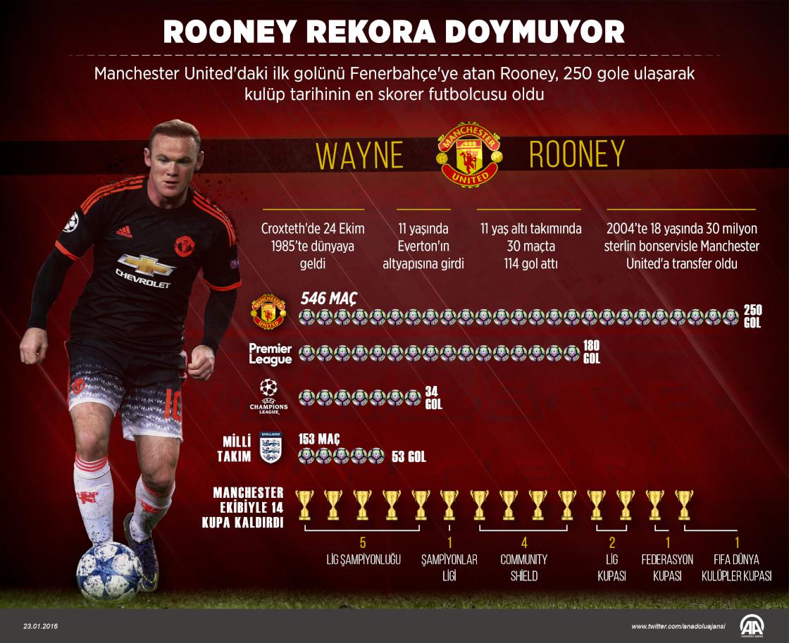 İngiliz futbolunun son dönemde yetiştirdiği en büyük yıldızlardan biri olan Wayne Rooney, forma giydiği Manchester United ile İngiltere Milli Takımı'nda kariyeri boyunca kırdığı rekorlarla şimdiden silinmez bir iz bıraktı. İngiltere Premier Lig ekibi Everton'dan 2004 yılında 18 yaşındayken Manchester United'a transfer olan Rooney gollerine, ilk maçında Fenerbahçe karşısında "hat-trick" yaparak başladı. United kariyerinde geçtiğimiz hafta lig maçında Stoke City karşısında beraberliği getiren deneyimli futbolcu 250 gole ulaşarak rekor kırdı. 1956-1973 yılları arasında attığı 249 golle rekoru elinde tutan "Sir" unvanlı Bobby Charlton'ı geride bırakan 31 yaşındaki Rooney, kulüp tarihine adını altın harflerle yazdırdı. ( Muhammed Ali Yiğit - Anadolu Ajansı )23 Ocak 2017•Güncelleme: 23 Ocak 2017