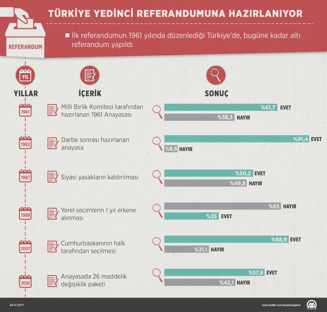 İlk referandumun 1961 yılında düzenlediği Türkiye'de, bugüne kadar altı referandum yapıldı. 1961, 1982, 1987, 2007 ve 2010 yıllarındaki referandumlarda sandıktan "evet" sonucu çıkarken, 1988'deki referandumda vatandaşların tercihi "hayır" oldu. Son referandum 12 Eylül 2010'da yapılan Türkiye'de, 18 maddelik yeni anayasa değişikliğini oylamak için mart sonu ya da nisan başı gibi yedinci kez referanduma gidilecek. ( Muhammed Ali Yiğit - Anadolu Ajansı )24 Ocak 2017•Güncelleme: 24 Ocak 2017