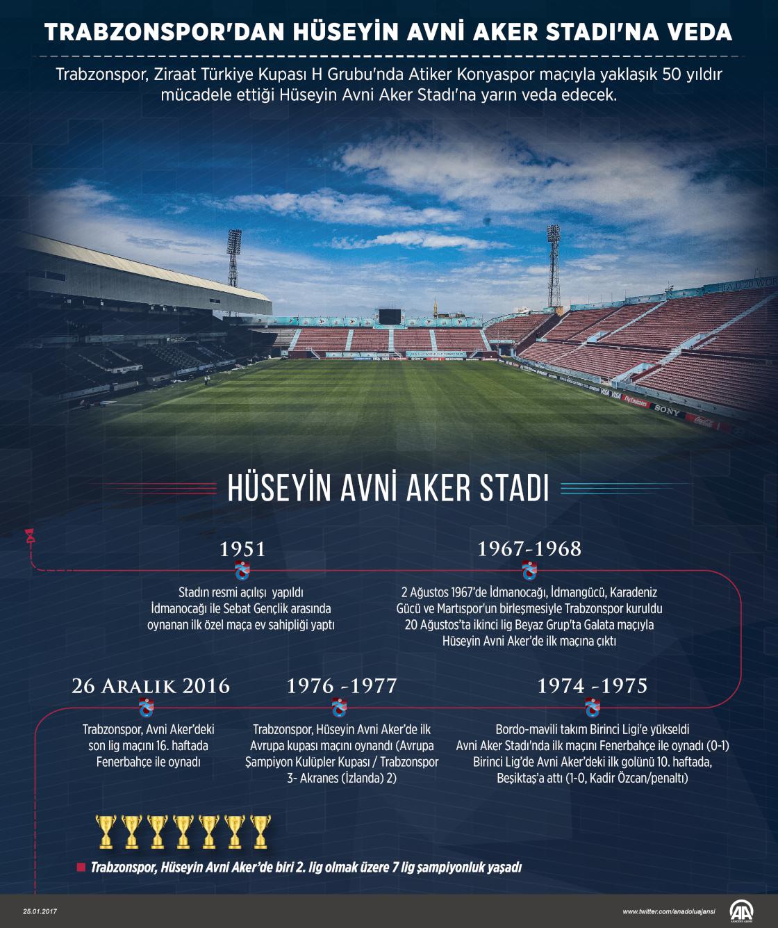 Resmi açılışı 1951'de yapılan ve bordo-mavili takımın birçok başarısına tanıklık eden tarihi stat, kapılarını son kez taraftara açacak. Spor Toto Süper Lig'de pazar günü Gaziantepspor ile Şenol Güneş Spor Kompleksi'ndeki yeni stadında karşılaşacak bordo-mavililer, Ziraat Türkiye Kupası'nda yarın Atiker Konyaspor ile yapacağı maçla Hüseyin Avni Aker Stadı'nda son kez sahaya çıkacak.