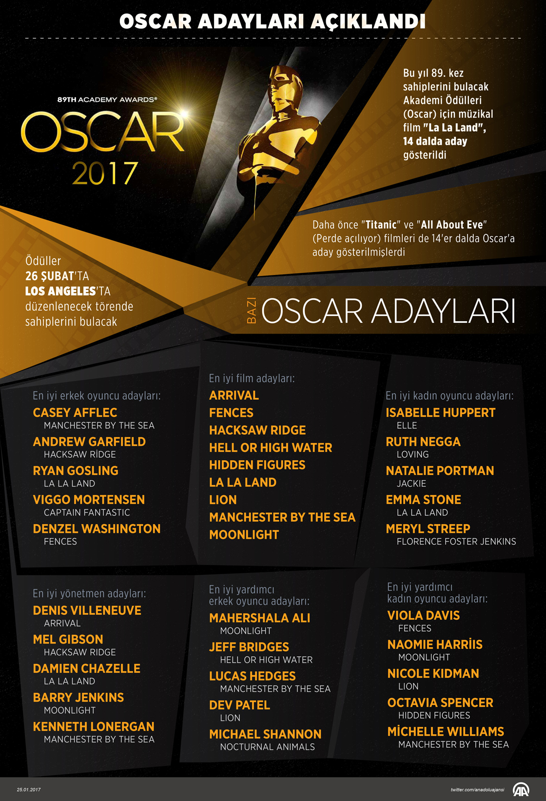 Sinemaseverlerin merakla beklediği Oscar ödülleri için adaylar açıklandı. Bu yıl 89. kez sahiplerini bulacak Akademi Ödülleri (Oscar) için müzikal film "La La Land", en iyi film, en iyi erkek ve kadın oyuncu, en iyi yönetmen kategorilerinin de aralarında bulunduğu 14 dalda aday gösterilerek bu alandaki rekora ortak oldu. ( Murat Usubaliev - Anadolu Ajansı )25 Ocak 2017•Güncelleme: 25 Ocak 2017