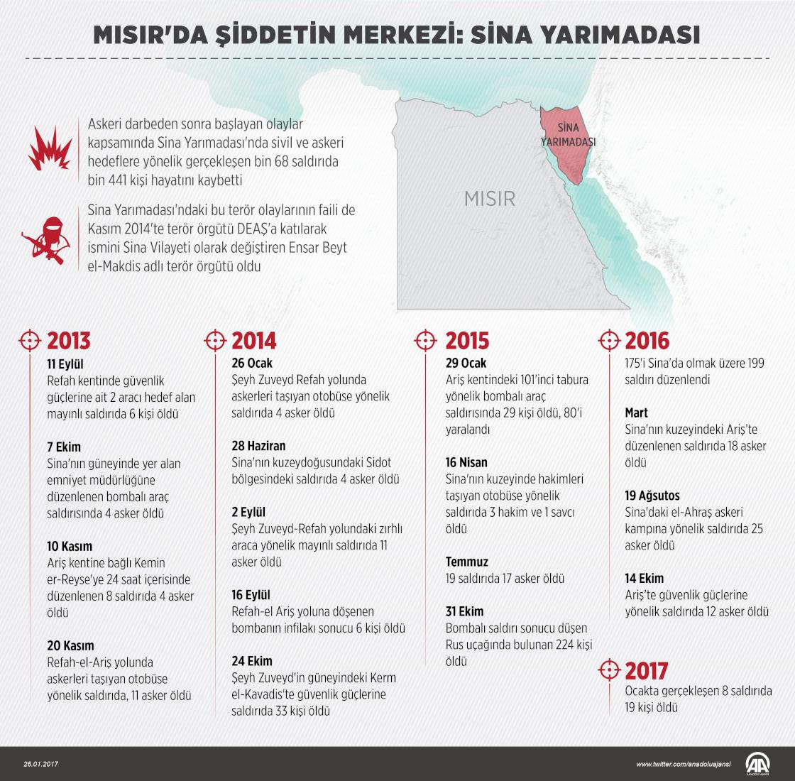 Mısır'da, demokratik yollarla seçilmiş ilk Cumhurbaşkanı Mursi'nin darbeyle görevinden uzaklaştırıldığı 3 Temmuz 2013'ten sonra başta Sina Yarımadası olmak üzere şiddet olayları her geçen gün artarken, ülkede istikrarsızlık da kontrol edilemez bir noktaya ulaştı. Güvenlik kaynakları, askeri darbeden sonra başlayan olaylar kapsamında Sina Yarımadası'nda sivil ve askeri hedeflere bin 68 saldırı gerçekleştiğini, bu terör olaylarında bin 441 kişinin hayatını kaybettiğini belirtti. Ülkeyi etkisi altına alan şiddet olaylarında şu ana kadar bin 150 güvenlik mensubu, Rus uçağında hayatını kaybedenler dahil 291 sivil öldü. ( Muhammed Ali Yiğit - Anadolu Ajansı )26 Ocak 2017•Güncelleme: 26 Ocak 2017