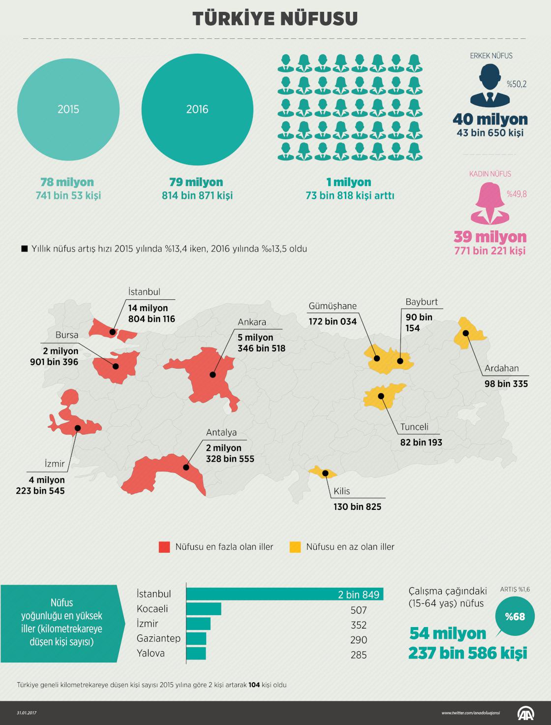 Türkiye İstatistik Kurumu (TÜİK), ''Adrese Dayalı Nüfus Kayıt Sistemi 2016 Sonuçları''nı açıkladı. Türkiye'nin nüfusu, 2016'da bir önceki yıla göre 1 milyon 73 bin 818 kişi artarak 79 milyon 814 bin 871 kişi oldu. Erkek nüfusun oranı yüzde 50,2 (40 milyon 43 bin 650 kişi), kadın nüfusun oranı ise yüzde 49,8 (39 milyon 771 bin 221 kişi) oldu. Yıllık nüfus artış hızı, 2015'te binde 13,4 iken, 2016'da binde 13,5'e yükseldi. Türkiye nüfusunun yüzde 18,5'inin ikamet ettiği İstanbul, 14 milyon 804 bin 116 kişiyle en çok nüfusa sahip il oldu. Tunceli ise 82 bin 193 kişiyle en az nüfusa sahip il olarak belirlendi. Nüfus yoğunluğu olarak ifade edilen "bir kilometrekareye düşen kişi sayısı" geçen yıl Türkiye genelinde 2015 yılına göre 2 kişi artarak 104 kişi oldu. ( Ahmet Burak Özkan - Anadolu Ajansı )31 Ocak 2017•Güncelleme: 31 Ocak 2017