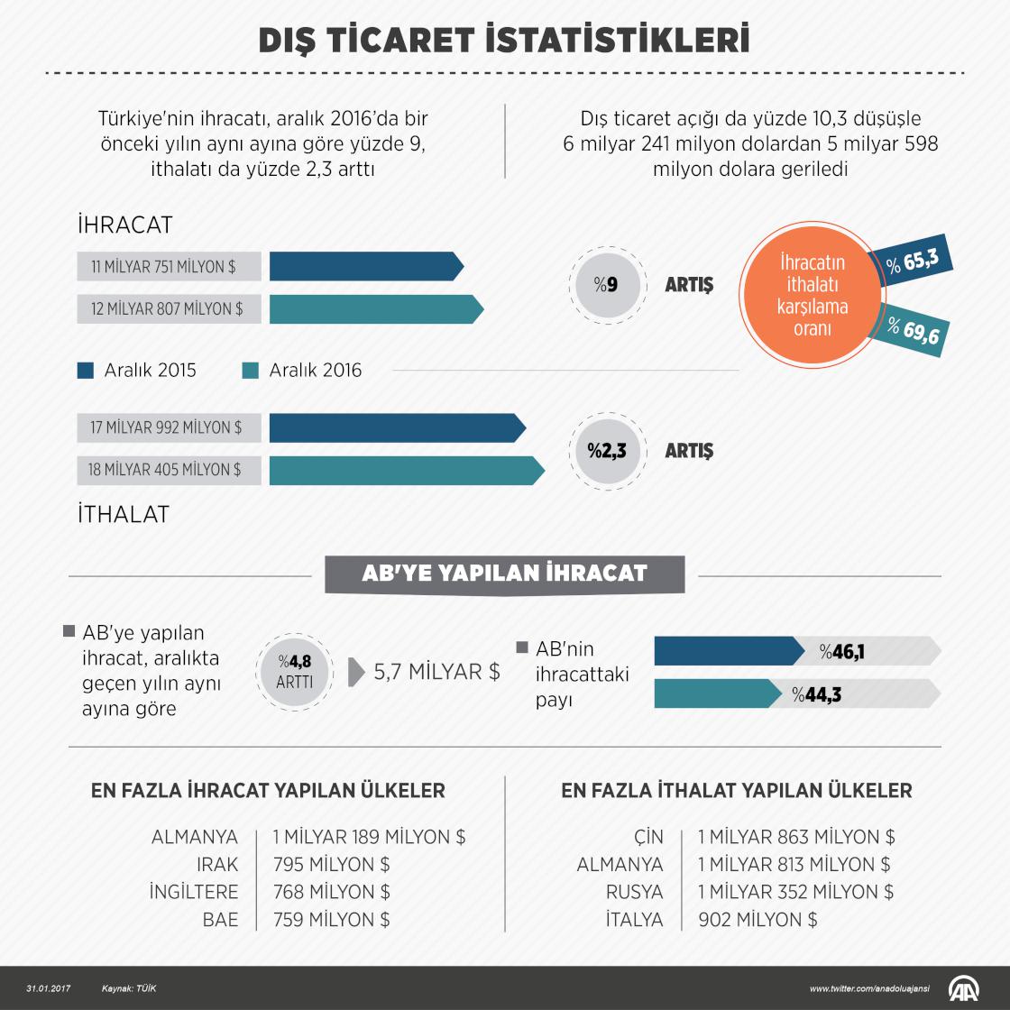 Türkiye'nin ihracatı, 2016 yılının aralık ayında bir önceki yılın aynı ayına göre yüzde 9 artarak 12 milyar 807 milyon dolar oldu. Söz konusu dönemde ithalat yüzde 2,3 artışla 18 milyar 405 milyon dolara yükseldi. ( Muhammed Ali Yiğit - Anadolu Ajansı )