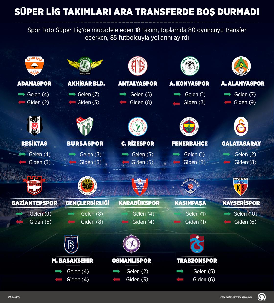 Spor Toto Süper Lig'de mücadele eden 18 takım, toplamda 80 oyuncuyu transfer ederken, 85 futbolcuyla yollarını ayırdı. Ara transfer döneminde 10 futbolcu kadrosuna katan Kayserispor, en çok transfer yapan takım oldu. Birer futbolcu takviyesi yapan Fenerbahçe, Kasımpaşa ve Atiker Konyaspor, ara transfer dönemini en sakin geçiren takımlar olarak dikkati çekti.