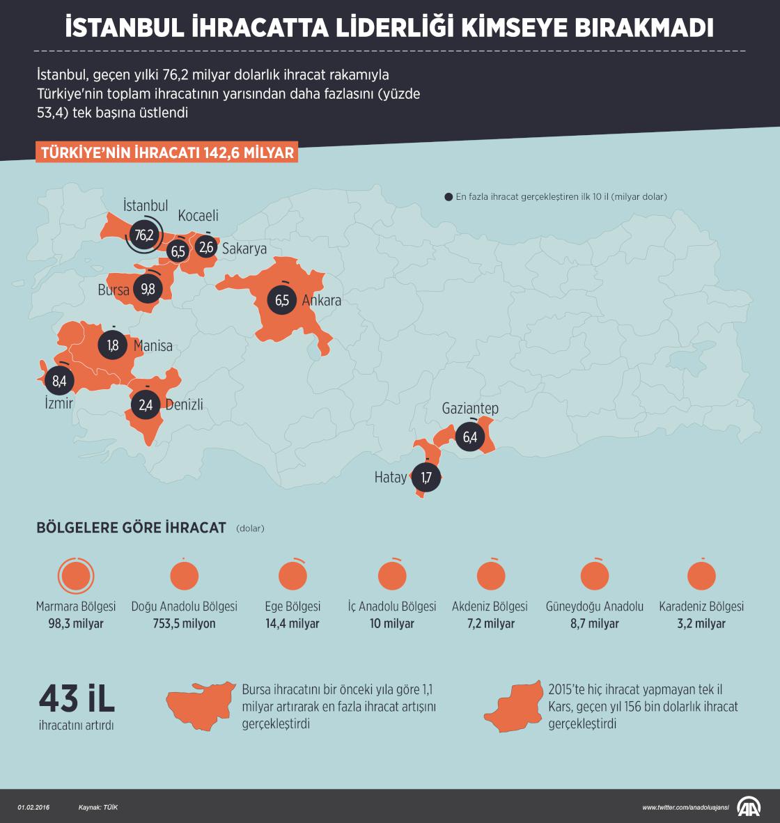 İstanbul, geçen yılki 76,2 milyar dolarlık ihracat rakamıyla Türkiye'nin toplam ihracatının yarısından daha fazlasını (yüzde 53,4) tek başına üstlendi. ( Yasin Demirci - Anadolu Ajansı )