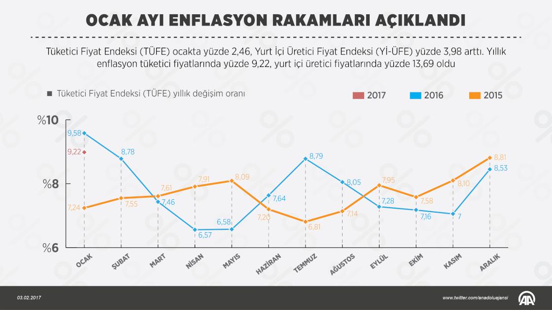 Tüketici Fiyat Endeksi (TÜFE) ocakta yüzde 2,46, Yurt İçi Üretici Fiyat Endeksi (Yİ-ÜFE) yüzde 3,98 arttı. Yıllık enflasyon tüketici fiyatlarında yüzde 9,22, yurt içi üretici fiyatlarında yüzde 13,69 oldu. ( Muhammed Ali Yiğit - Anadolu Ajansı )