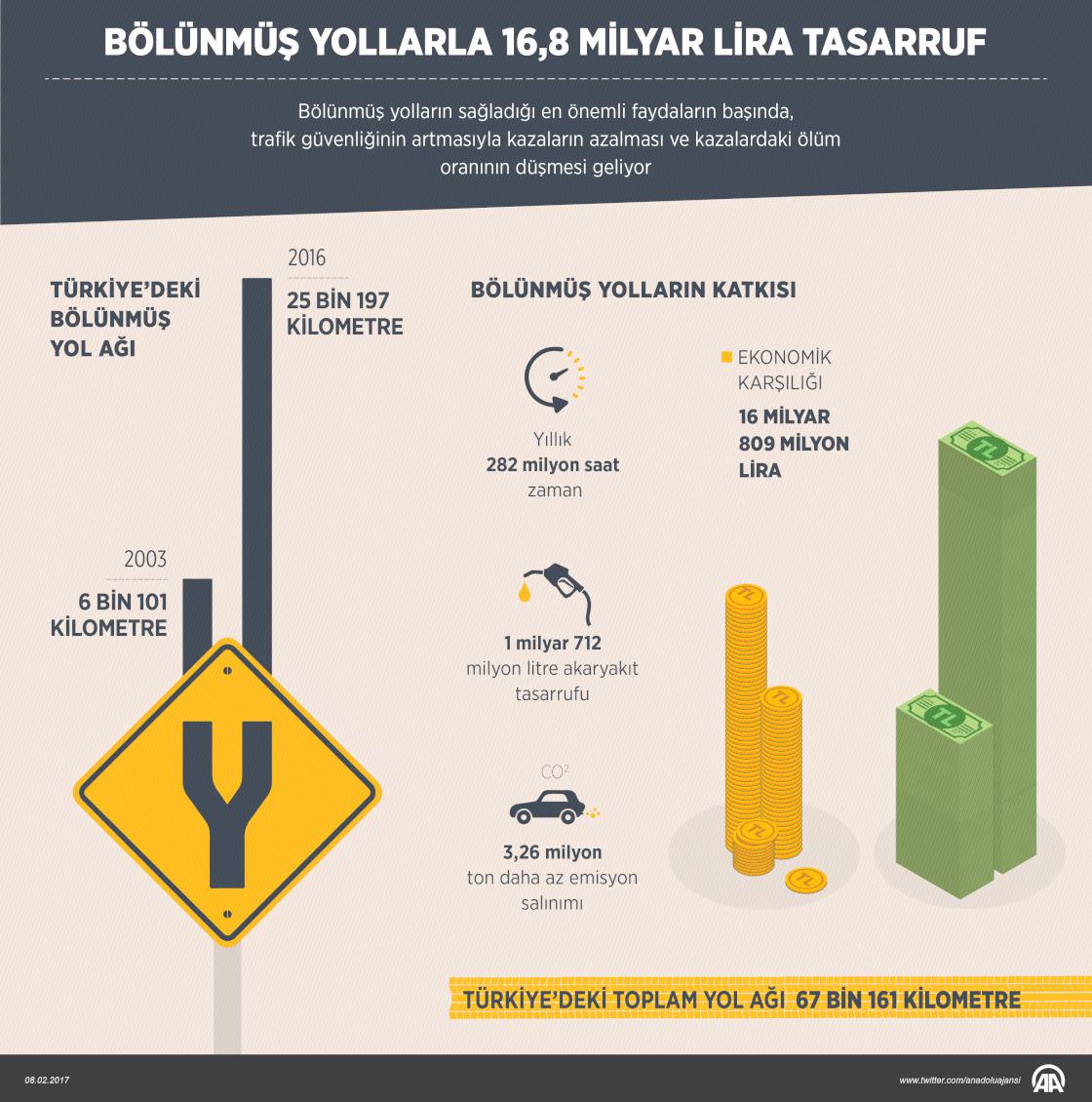 Türkiye'de 25 bin kilometreyi aşan bölünmüş yol sayesinde yıllık 282 milyon saat zaman, yaklaşık 1 milyar 712 milyon litre akaryakıt tasarrufu sağlandı. Söz konusu tasarruflarla geçen yıl 16 milyar 809 milyon lira ekonomik fayda gerçekleşti. ( Yasin Demirci - Anadolu Ajansı )08 Şubat 2017•Güncelleme: 08 Şubat 2017