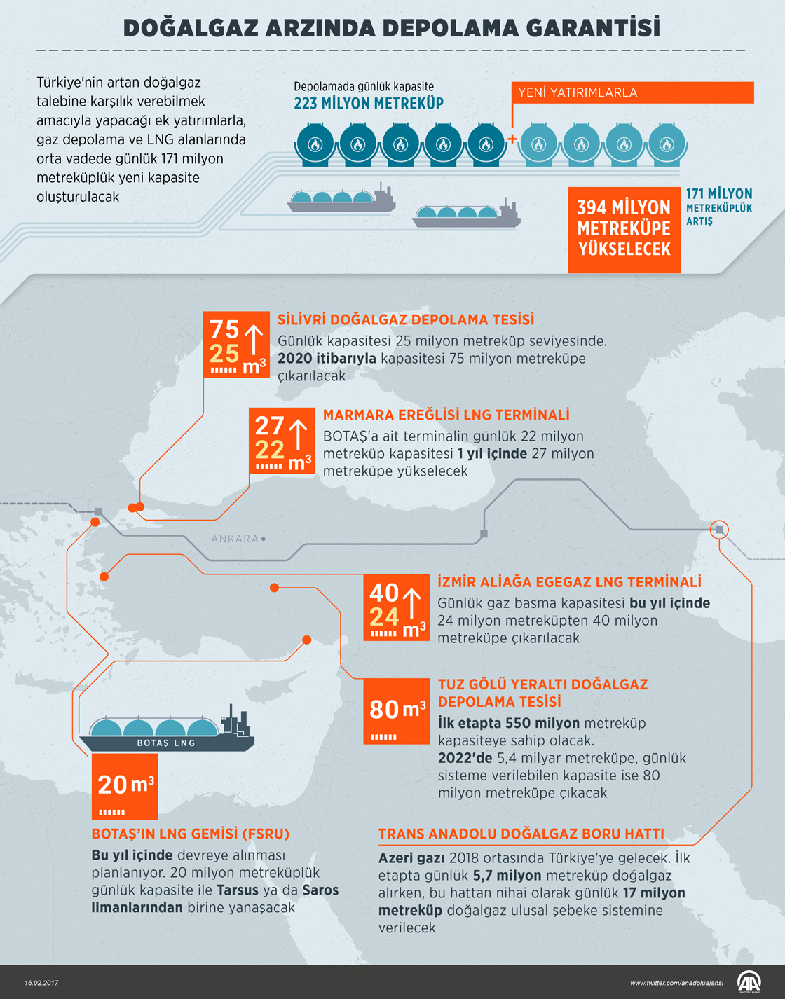 Türkiye'nin ulusal sisteme verebileceği günlük doğalgaz kapasitesinin 5 yıllık orta vadede 171 milyon metreküplük artışla 400 milyon metreküpe ulaşması planlanıyor.