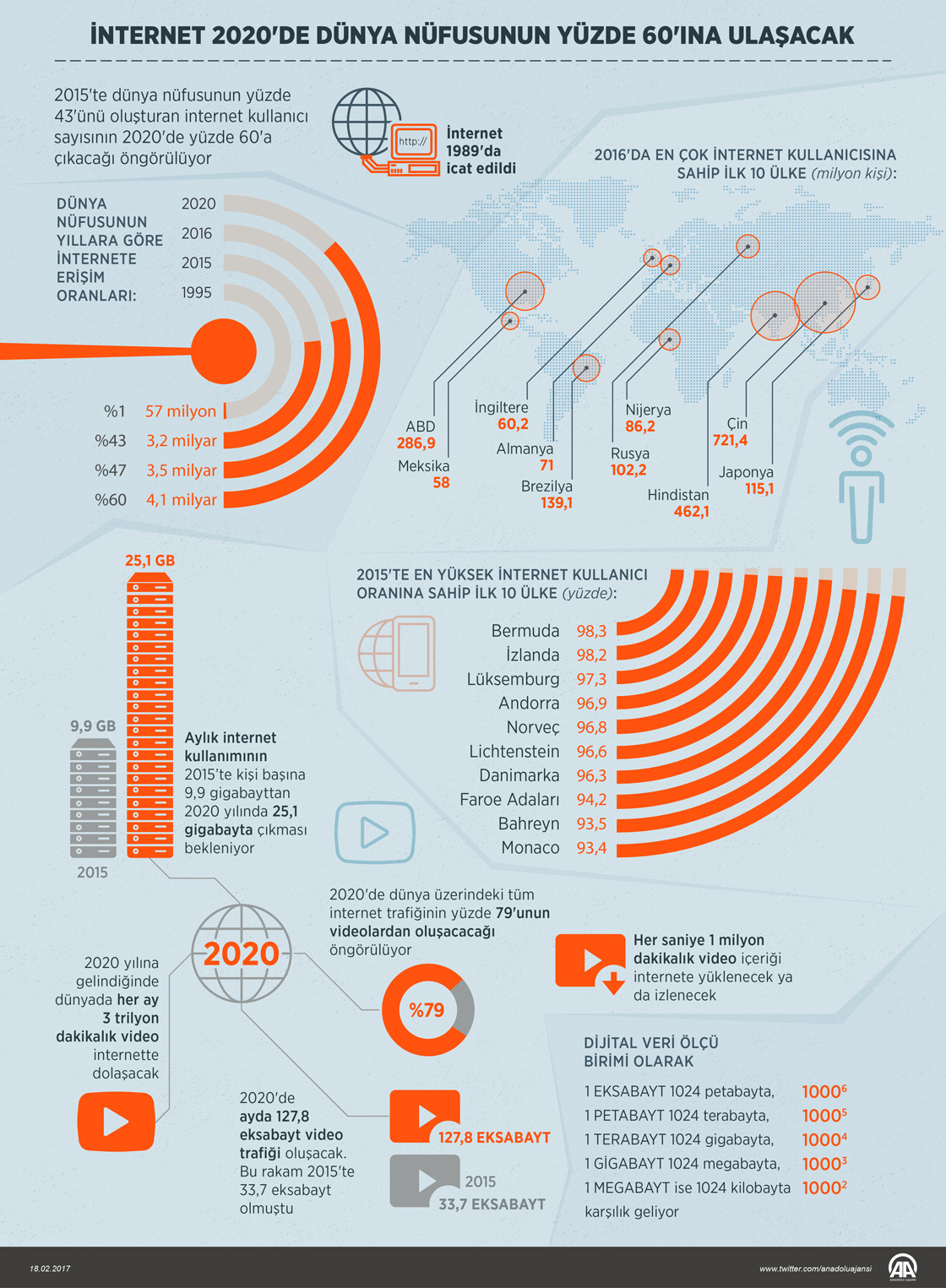 Dijital devrim" olarak adlandırılan interneti kullanan kişi sayısının 2020 yılında dünya nüfusunun yüzde 60'ına ulaşması bekleniyor.