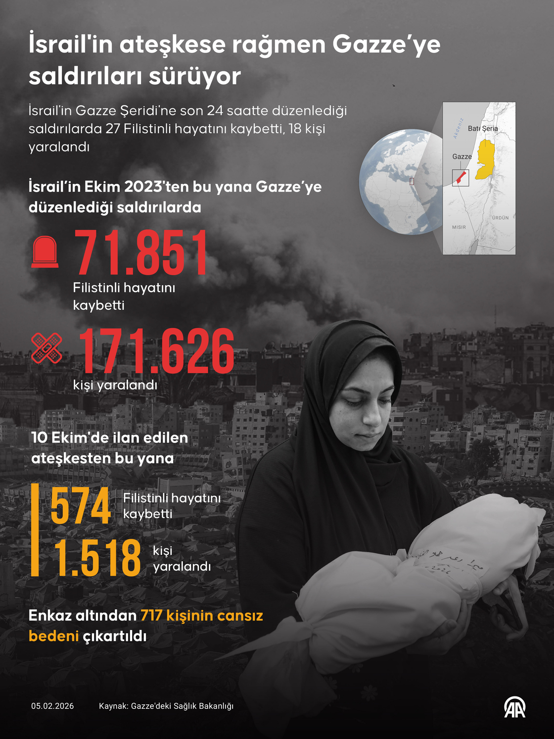 Gazze'deki Sağlık Bakanlığı, ateşkesi ihlal eden İsrail'in Gazze Şeridi'nde son 24 saatte düzenlediği saldırılarda 27 Filistinlinin yaşamını yitirdiğini bildirdi. (Grafik: Omar Zaghloul/AA)