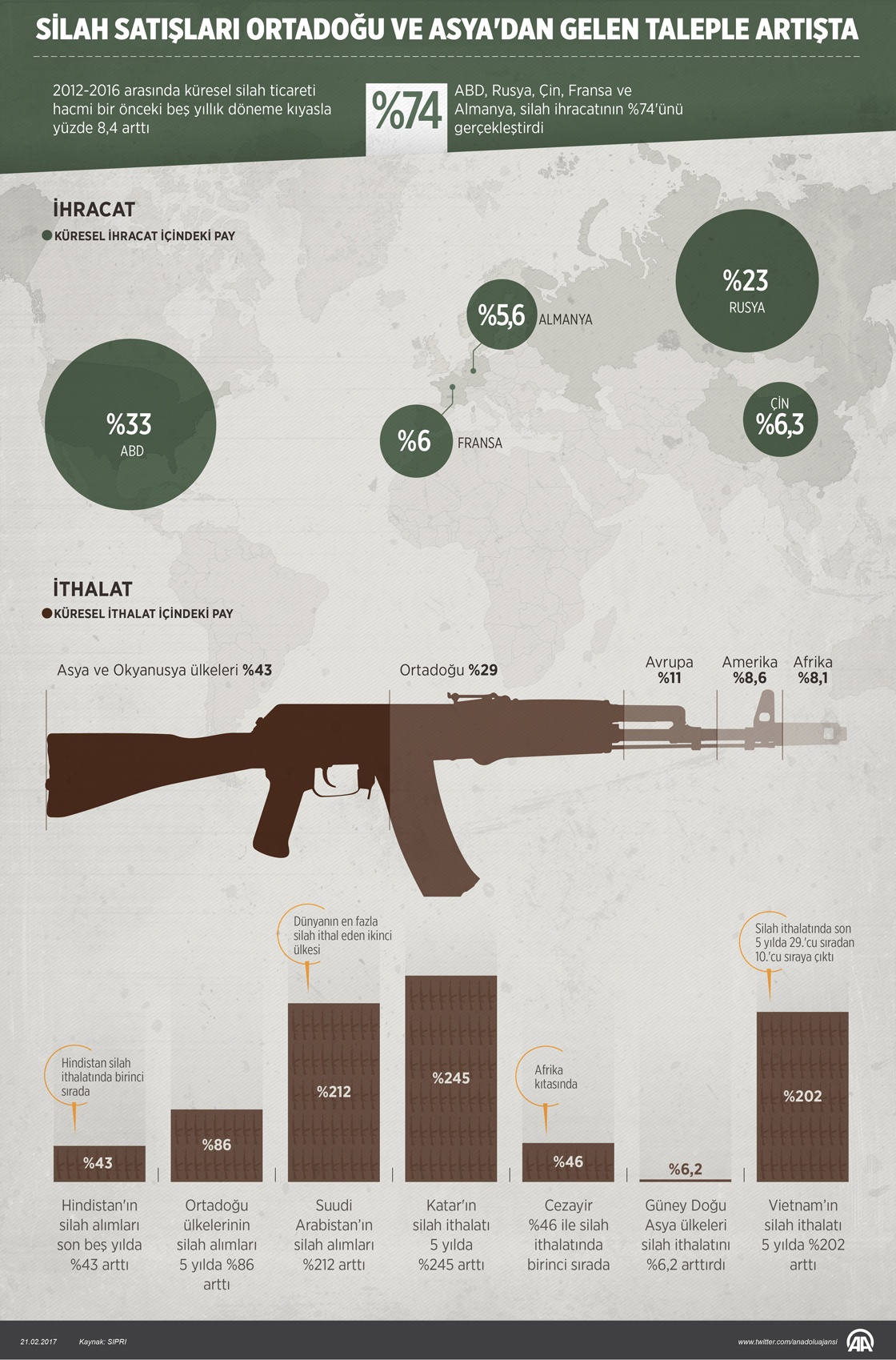 Stockholm Barış Araştırmaları Enstitüsü (SIPRI), Ortadoğu ve Asya bölgelerinden gelen talep artışı nedeniyle 2012-2016 yılları arasında silah ticaretinin, Soğuk Savaş sonrasındaki en yüksek düzeye ulaştığını açıkladı. Merkezi İsveç'te merkezi bulunan SIPRI'nin 2012-2016 silah satışlarına ilişkin hazırladığı raporda, 2004'ten bu yana artış gösteren satışların son 5 yılda, bir önceki 5 yıla kıyasla yüzde 8,4 gibi önemli bir oranda arttığı bildirildi. Aynı dönemde Asya ve Ortadoğu'ya yapılan silah satışları artarken, Avrupa, Amerika ve Afrika'ya satışların azaldığı kaydedildi. ( Yasin Demirci - Anadolu Ajansı )22 Şubat 2017•Güncelleme: 22 Şubat 2017