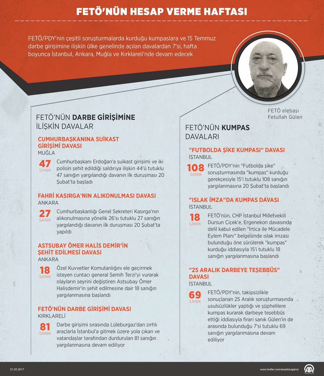 Fetullahçı Terör Örgütü/Paralel Devlet Yapılanması'nın (FETÖ) çeşitli soruşturmalarda kurduğu kumpaslara ve 15 Temmuz darbe girişimine ilişkin ülke genelinde açılan 7 dava kapsamında 368 sanık hafta boyunca İstanbul, Ankara, Muğla ve Kırklareli'nde devam duruşmalarda savunmalarını yapıyor. ( Murat Usubaliev - Anadolu Ajansı )22 Şubat 2017•Güncelleme: 22 Şubat 2017