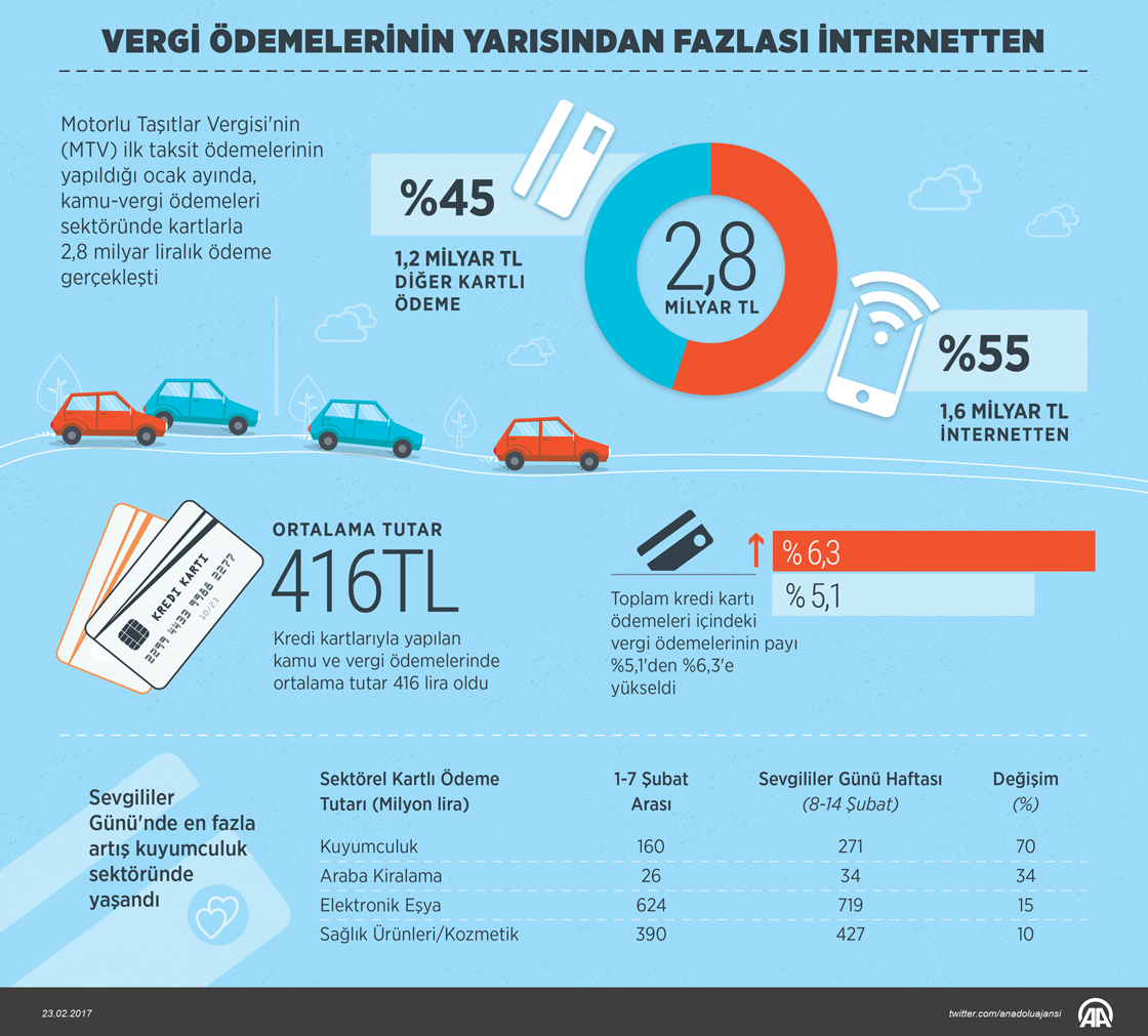 Motorlu Taşıtlar Vergisi'nin (MTV) ilk taksit ödemelerinin yapıldığı ocak ayında, kamu-vergi ödemeleri sektöründe kartlarla 2,8 milyar liralık ödeme gerçekleşti. Grafik: AA/Murat Usubaliev