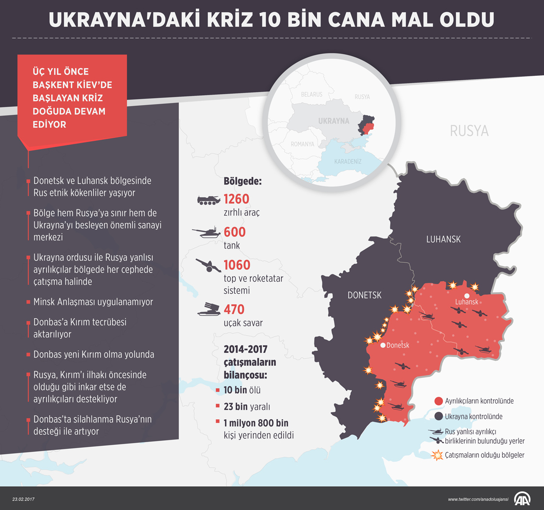 Kiev'deki Bağımsızlık Meydanı'nda başlayan ve ülkenin doğusuna sıçrayan krizde, BM verilerine göre 10 bin kişi hayatını kaybetti, 23 bin kişi yaralandı, 1 milyon 800 bin kişi yerinden oldu. Rusya Devlet Başkanı Putin'in, ayrılıkçıların kontrolü altındaki bölgesinde yaşayanların belgelerinin Rusya’da kabul edileceğine ilişkin kararı, Donbas'ın yeni Kırım olup olmayacağı tartışmalarına yol açtı. Putin'in kararnameyi imzalaması, bölge ile ilgili "yeni bir plan"ın başlangıcı olarak yorumlanıyor. Grafik: AA/Yasin Demirci23 Şubat 2017•Güncelleme: 23 Şubat 2017