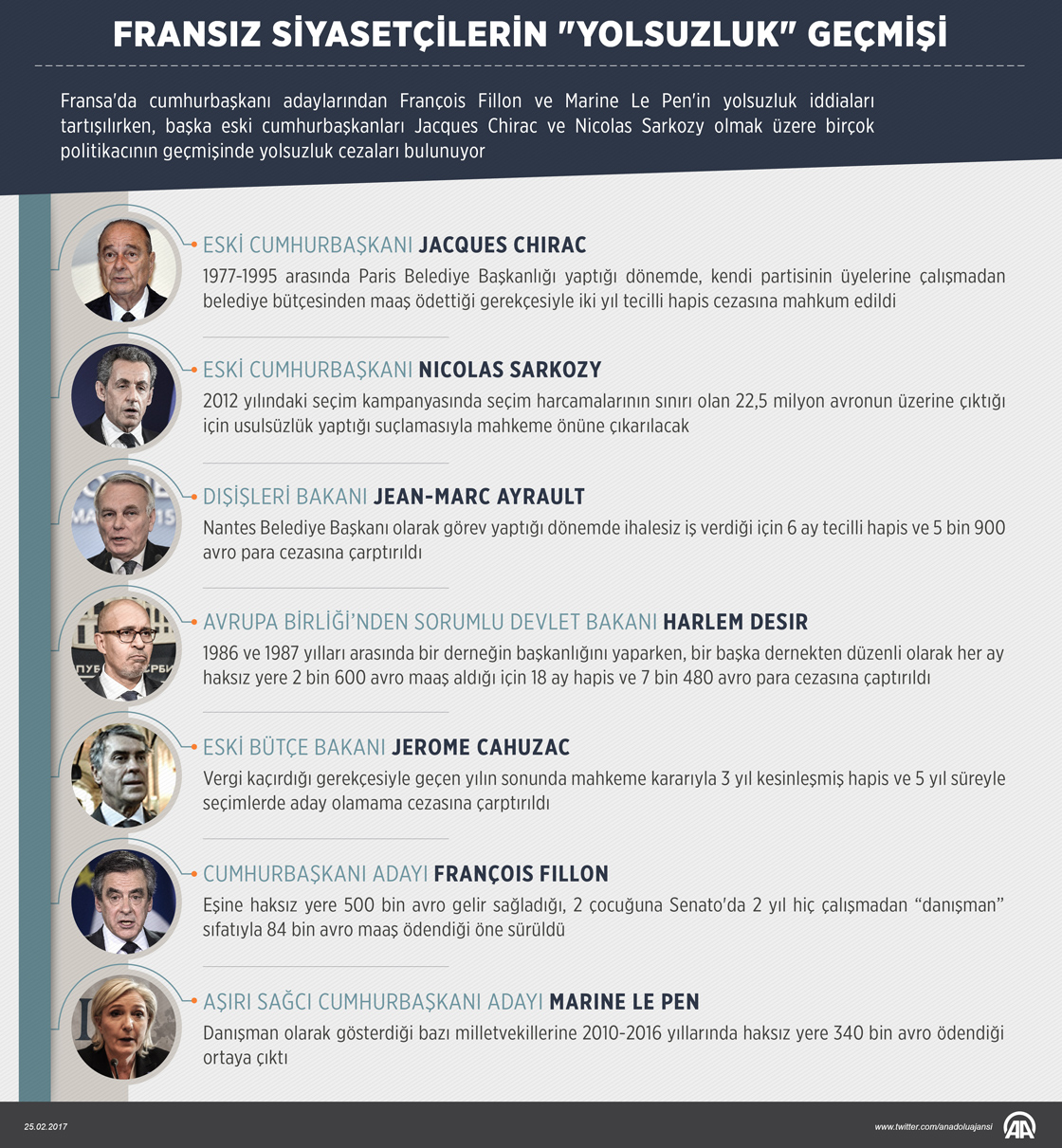 Fransa'da nisan ve mayıs ayında yapılacak cumhurbaşkanlığı seçimleri öncesi, merkez sağ Cumhuriyetçiler Partisinin adayı François Fillon ve aşırı sağcı Ulusal Cephe Partisinin adayı Marine Le Pen ile ilgili yolsuzluk tartışmaları ülkenin gündemini meşgul ediyor.25 Şubat 2017•Güncelleme: 25 Şubat 2017