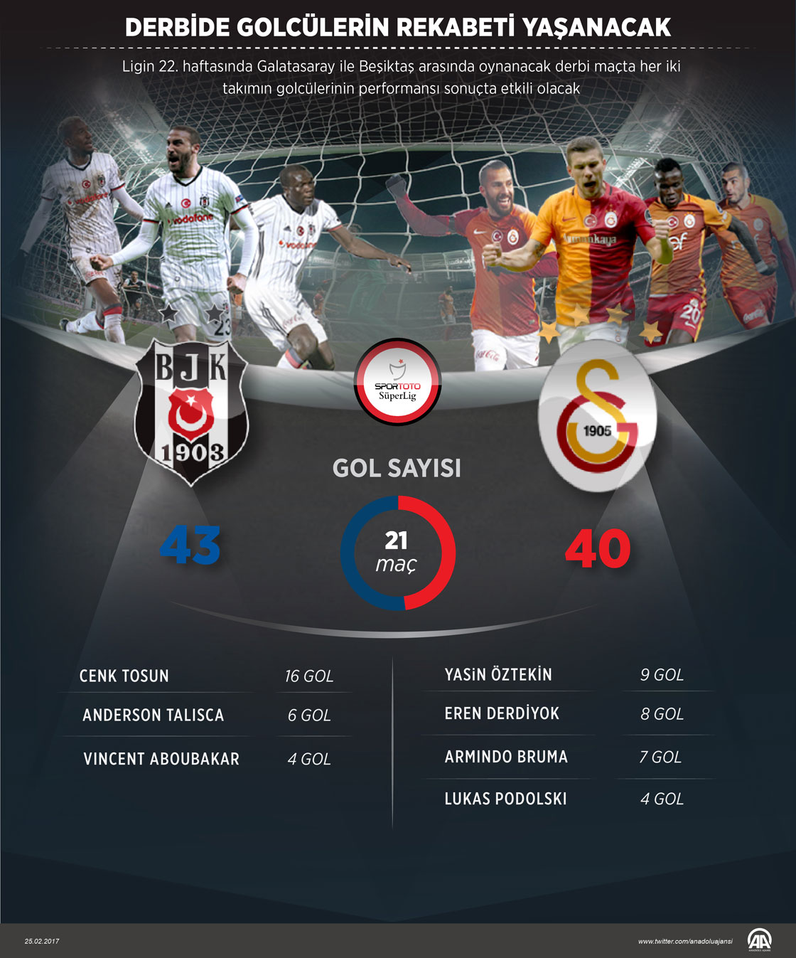Spor Toto Süper Lig'in 22. haftasında Galatasaray ile Beşiktaş arasında 27 Şubat Pazartesi günü oynanacak derbi maçta gözler her iki takımın golcülerinin üzerinde olacak. Ligin en skorer iki takımın mücadelesi öncesi golcü oyuncular da formlarıyla dikkati çekiyor. Beşiktaş ligdeki 21 maçta 43 golle en fazla fileleri havalandıran takım olurken, Galatasaray ise 40 golle ikinci sırada bulunuyor. Türk Telekom Arena'ya lider olarak konuk olacak Beşiktaş'ta Cenk Tosun, Anderson Talisca ve Vincent Aboubakar, bu sezon takımlarının ligde attığı gollerin yarısına yakınını kaydetti. Taraftarlarının desteğiyle rakibini yenerek puan farkını kapatmayı hedefleyen Galatasaray'ın gollerinin yarısından fazlasını ise Yasin Öztekin, Eren Derdiyok, Lukas Podolski ve Armindo Bruma attı. ( Gözde Gültekinler - Anadolu Ajansı )25 Şubat 2017•Güncelleme: 25 Şubat 2017
