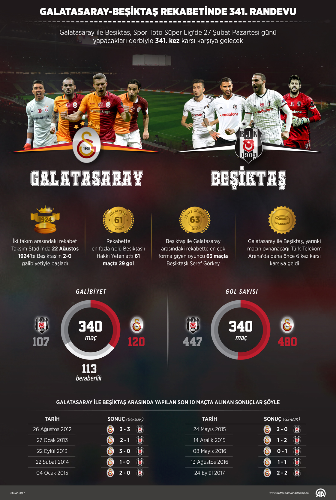 Galatasaray ile Beşiktaş, Spor Toto Süper Lig'de yarın yapacakları derbiyle 341. kez karşı karşıya gelecek.