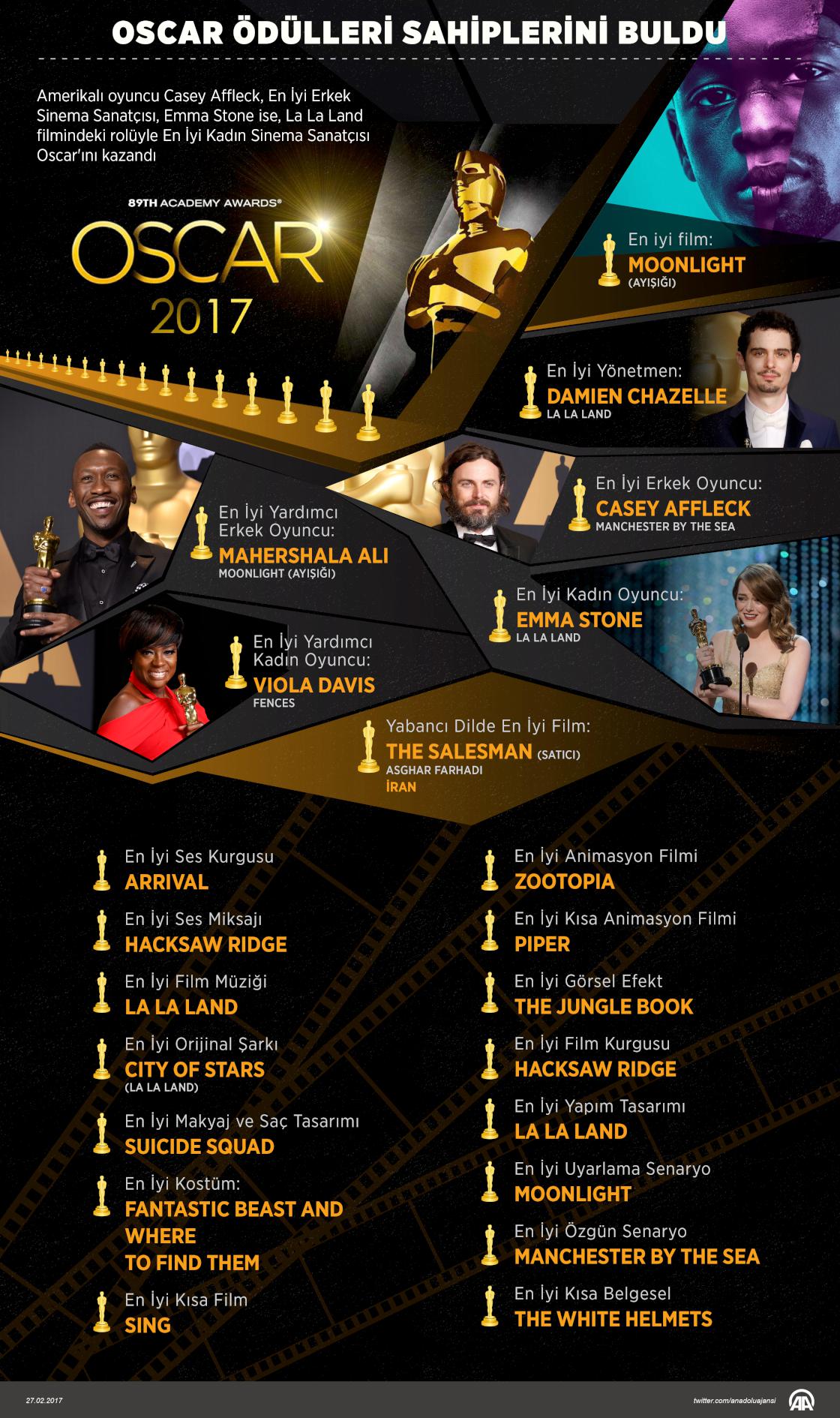 Amerikan Sinema Bilimleri ve Sanat Akademisinin dünyanın en prestijli ödüllerini dağıttığı Dolby Tiyatrosu'ndaki Oscar gecesinde, Amerikalı oyuncu Casey Affleck, En iyi erkek oyuncu, Emma Stone ise La La Land filmindeki rolüyle En iyi kadın oyuncu ödülünü kazandı. ( Murat Usubaliev - Anadolu Ajansı )27 Şubat 2017•Güncelleme: 27 Şubat 2017