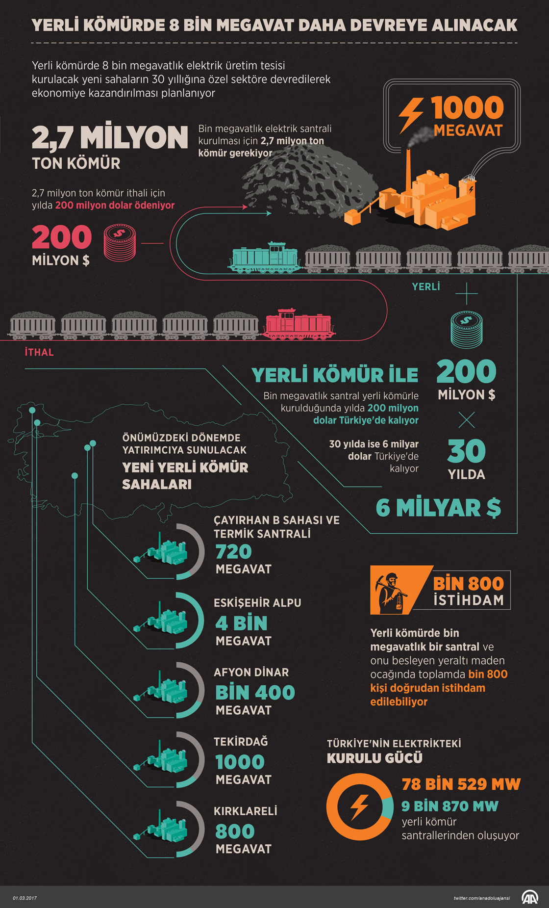 Türkiye'nin "yerli enerji" stratejisi çerçevesinde, yaklaşık 8 bin megavat elektrik üretim kapasitesine sahip olacağı öngörülen yeni kömür sahalarının 30 yıllığına özel sektöre devredilerek ekonomiye kazandırılması planlanıyor. ( Murat Usubaliev - Anadolu Ajansı )01 Mart 2017•Güncelleme: 01 Mart 2017