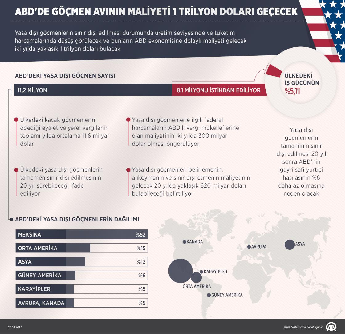 ABD'de bulunan yaklaşık 11,2 milyon yasa dışı göçmeni belirlemenin, alıkoymanın ve sınır dışı etmenin maliyetinin gelecek 20 yılda yaklaşık 620 milyar doları bulabileceği belirtiliyor. Yasa dışı göçmenlerle ilgili federal harcamaların ABD'li vergi mükelleflerine maliyetinin 2 yılda 300 milyar dolar olması öngörülüyor. ABD'deki yaklaşık 11,2 milyon yasa dışı göçmenden istihdam edilen 8,1 milyonu, ülkedeki iş gücü piyasasının yüzde 5,1'ini oluşturuyor. ( Yasin Demirci - Anadolu Ajansı )01 Mart 2017•Güncelleme: 01 Mart 2017