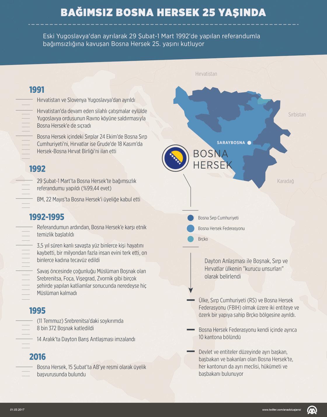 Eski Yugoslavya'dan ayrılarak 29 Şubat-1 Mart 1992'de yapılan referandumla bağımsız bir devlet olan Bosna Hersek 25. yaşını kutluyor. Çeyrek asır önce yapılan ve ülkedeki Sırpların büyük çoğunluğunun boykot ettiği referanduma halkın yüzde 64,3'ü katılmış, referandumda oy kullananların yüzde 99,44'ünün bağımsızlık için "evet" oyu kullanmasıyla Bosna Hersek bağımsızlığını ilan etmişti. Referandumun sonucu Bosna Hersek'i bağımsız bir devlet yapmıştı ancak aynı zamanda yüzbinlerce kişinin hayatını kaybettiği, bir milyondan fazla insanın göç etmek zorunda kaldığı 3,5 yıl süren kanlı savaşın da başlangıcı olmuştu. ( Ahmet Burak Özkan - Anadolu Ajansı )01 Mart 2017•Güncelleme: 01 Mart 2017