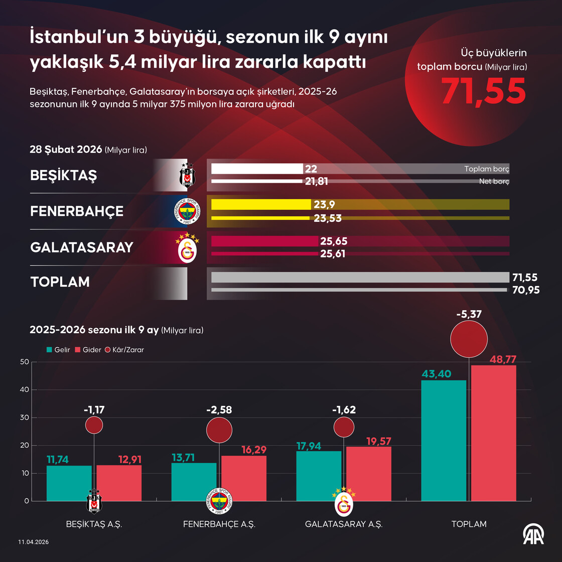 İstanbul’un 3 büyüğü, sezonun ilk 9 ayını yaklaşık 5,4 milyar lira zararla kapattı