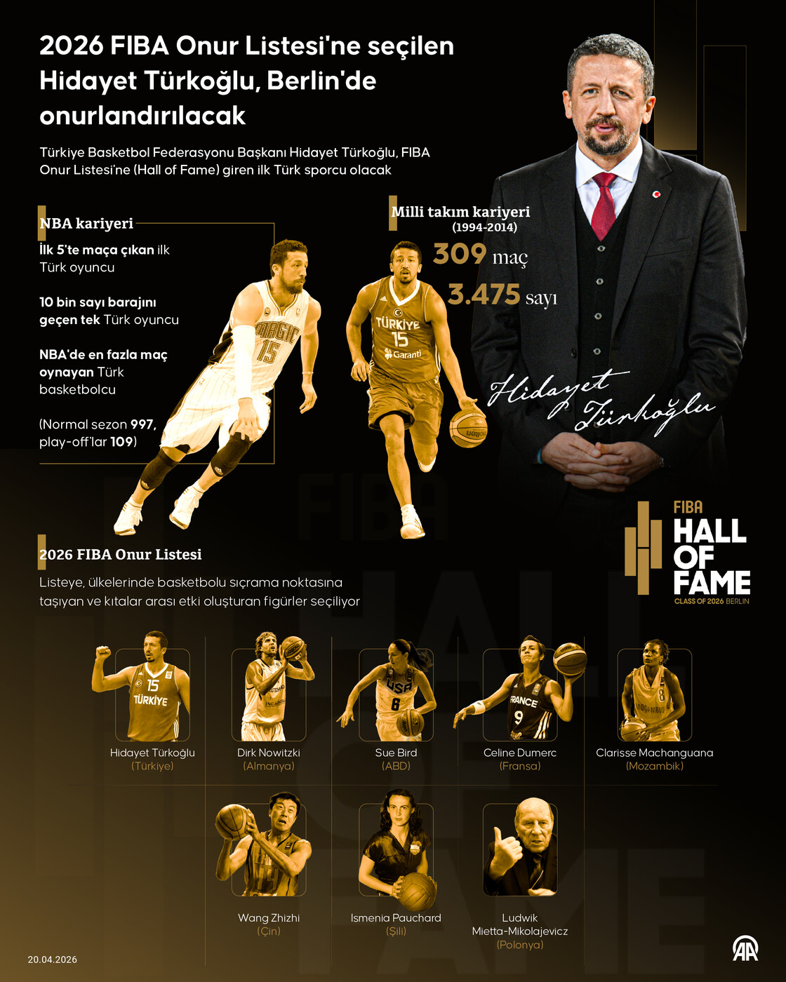 FIBA tarafından 2026 Onur Listesi'ne (Hall of Fame) seçilerek tarihe geçen Türkiye Basketbol Federasyonu (TBF) Başkanı Hidayet Türkoğlu, 21 Nisan'da düzenlenecek törenle onurlandırılacak.