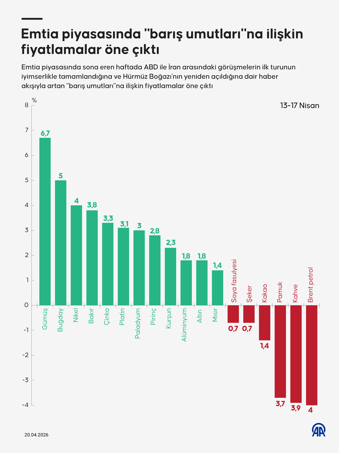 Emtia piyasasında sona eren haftada ABD ile İran arasındaki görüşmelerin ilk turunun iyimserlikle tamamlandığına ve Hürmüz Boğazı'nın yeniden açıldığına dair haber akışıyla artan "barış umutları"na ilişkin fiyatlamalar öne çıktı.