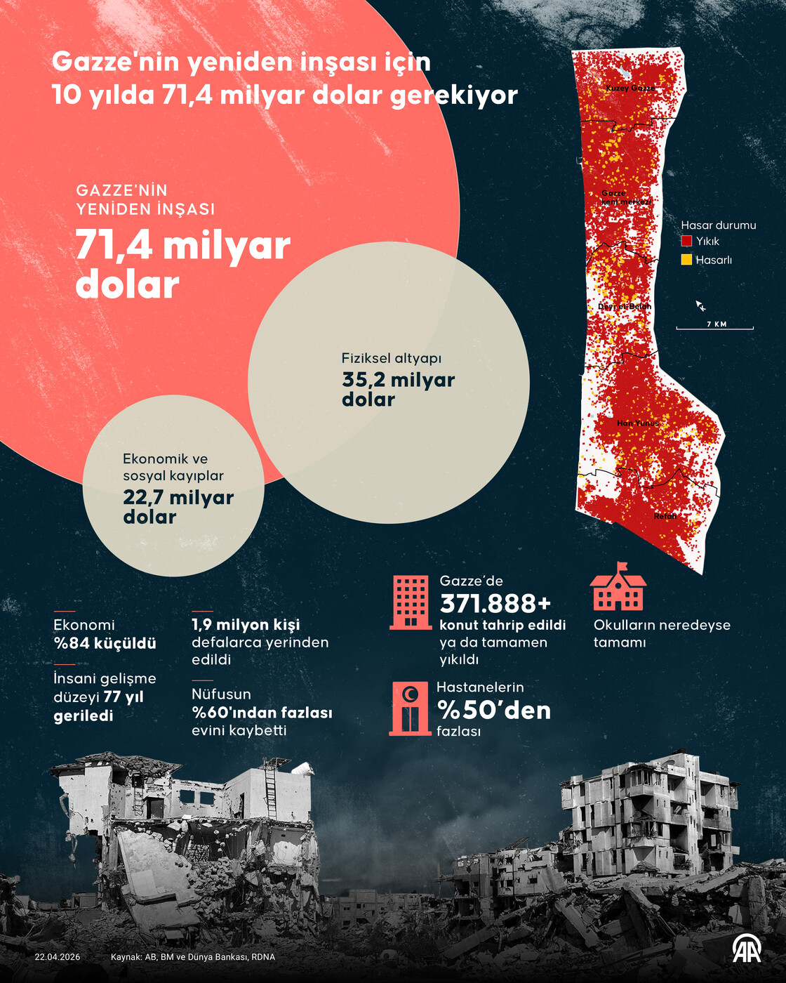 Avrupa Birliği (AB), Birleşmiş Milletler (BM) ve Dünya Bankası, 24 aylık çatışmanın ardından Gazze'nin yeniden inşası için 10 yılda 71,4 milyar dolar gerektiğini belirledi.