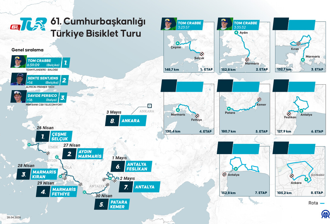 61. Cumhurbaşkanlığı Türkiye Bisiklet Turu'nun (TUR 2026) ikinci etabın galibi, Team Flanders-Baloise takımının Belçikalı sporcusu Tom Crabbe oldu.