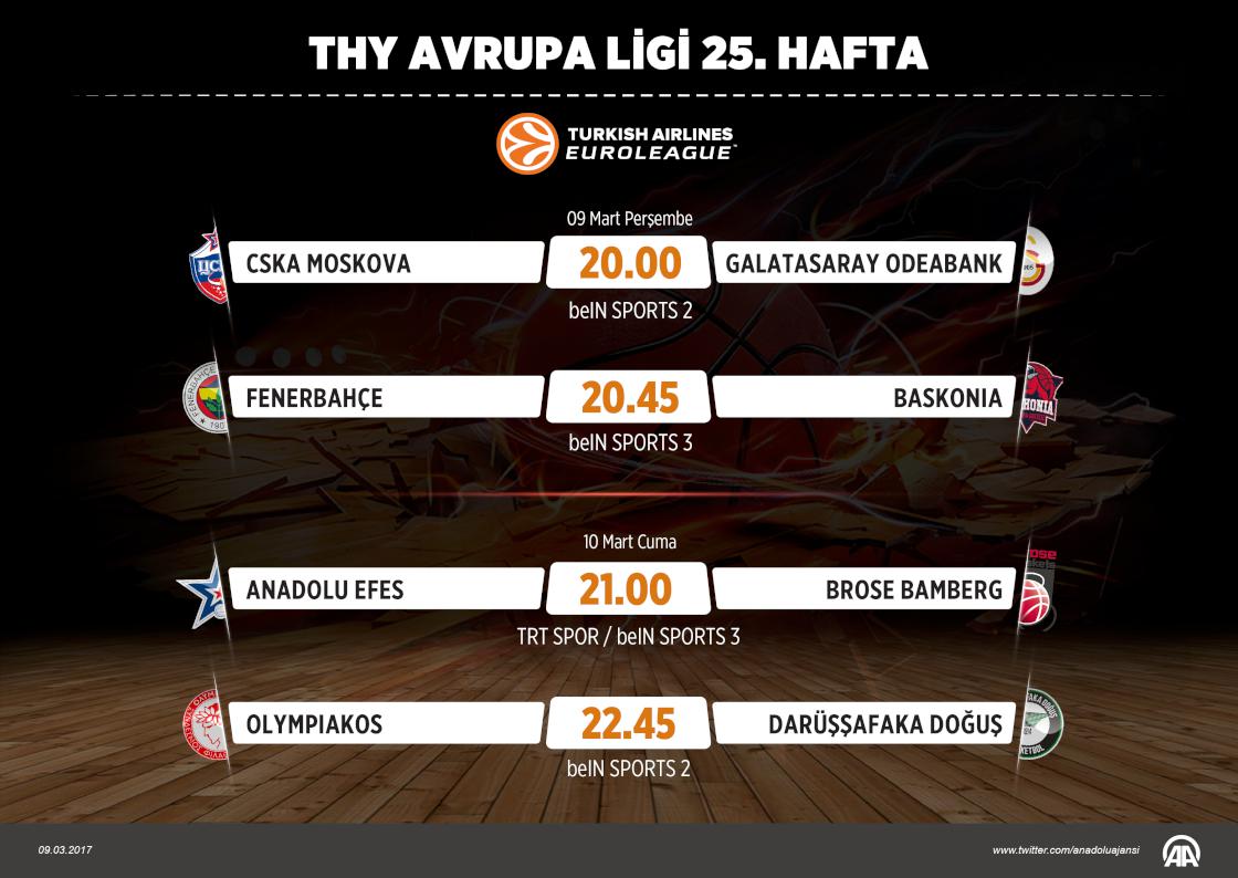 Avrupa basketbolunun kulüpler düzeyindeki bir numaralı organizasyonu THY Avrupa Ligi'nde heyecan, 25. hafta maçlarıyla sürecek. Galatasaray Odeabank'ın Rus temsilcisi CSKA Moskova'ya konuk olacağı yarınki maçlarda, Fenerbahçe ise İspanya'nın Baskonia takımını ağırlayacak. Anadolu Efes'in Alman ekibi Brose Bamberg'i konuk edeceği 10 Mart Cuma günü, Darüşşafaka Doğuş da deplasmanda Yunanistan'ın Olympiakos ekibiyle karşılaşacak.