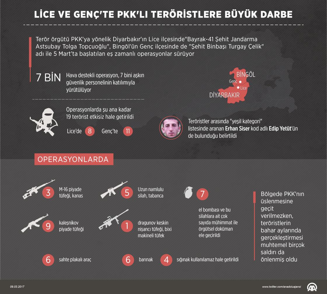 Terör örgütü PKK'ya yönelik 5 Mart günü Türk Silahlı Kuvvetleri (TSK), emniyet unsurları ve güvenlik korucularından oluşan 7 bini aşkın personelin katılımıyla Diyarbakır Lice'de "Bayrak-41 Şehit Jandarma Astsubay Tolga Topçuoğlu" ile Bingöl'ün Genç ilçesinde "Şehit Binbaşı Turgay Çelik" adlı eş zamanlı operasyon başlatıldı. Operasyonda 8'i Lice'de olmak üzere biri kadın 19 PKK'lı terörist etkisiz hale getirildi. Teröristlerden birinin İçişleri Bakanlığının aranan teröristler listesinde "yeşil kategori"de yer alan Erhan Siser kod adlı Edip Yetüt olduğu belirtildi. Operasyon kapsamında yapılan aramalarda 5 günde, 3 M-16 piyade tüfeği, kanas, 5 uzun namlulu silah, tabanca, 9 kalaşnikof piyade tüfeği, 1 dragunov keskin nişancı tüfeği, bixi makineli tüfek, 23 şarjör, 120 fişek, 7 el bombası ile örgütsel doküman ele geçirildi. ( Ahmet Burak Özkan - Anadolu Ajansı )09 Mart 2017•Güncelleme: 09 Mart 2017