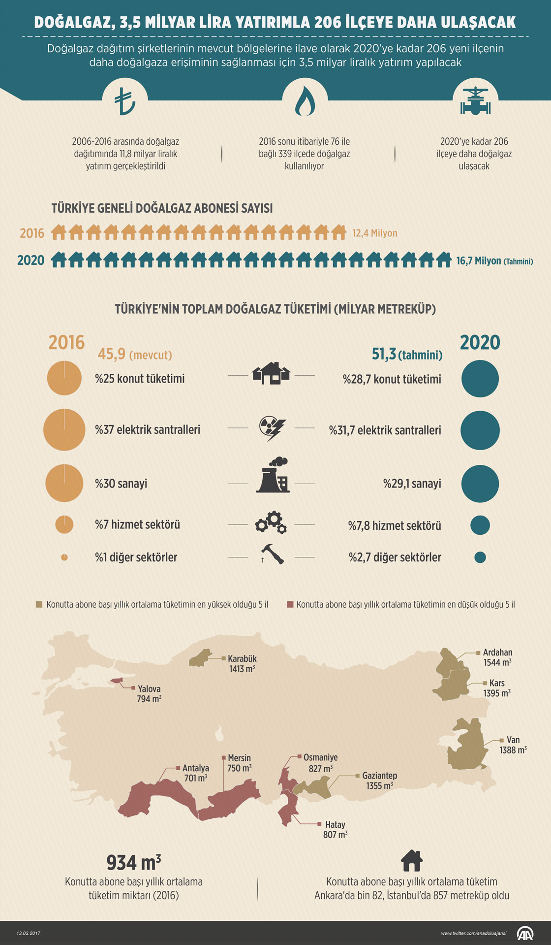 Dağıtım şirketlerinin mevcut bölgelerine ilave olarak 2020'ye kadar 206 yeni ilçenin daha doğalgaza erişiminin sağlanması için 3,5 milyar liralık yatırım yapılacak. Grafik: AA/Muhammed Ali Yiğit