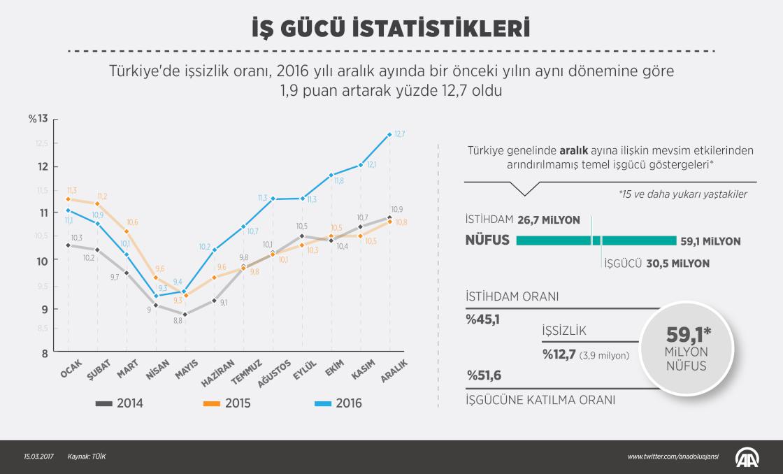 Türkiye'de işsizlik oranı, 2016 Aralık ayında bir önceki yılın aynı dönemine göre 1,9 puan yükselerek yüzde 12,7'ye çıktı. Söz konusu dönemde işsiz sayısı 668 bin kişi artarak 3 milyon 872 bin kişi oldu. ( Ahmet Burak Özkan - Anadolu Ajansı )
