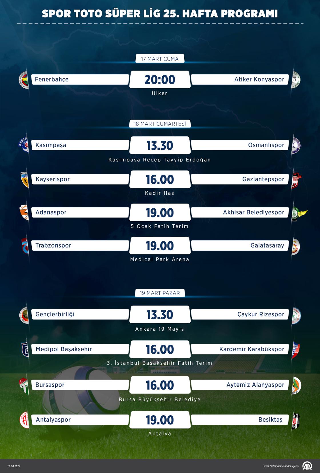 Spor Toto Süper Lig'de 25. haftanın ilk maçında Fenerbahçe ile Atiker Konyaspor yarın karşı karşıya gelecek. 25. hafta maçlarında 18 Mart Cumartesi günü 4, 19 Mart Pazar günü ise 4 maç oynanacak ( Muhammed Ali Yiğit - Anadolu Ajansı )