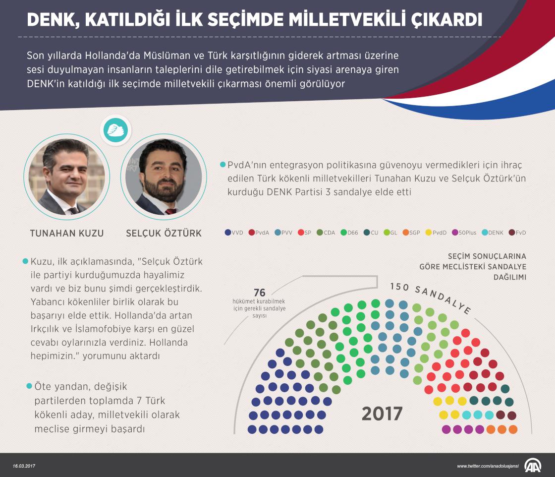 Son yıllarda Hollanda'da Müslüman ve Türk karşıtlığının giderek artması üzerine sesi duyulmayan insanların taleplerini dile getirebilmek için siyasi arenaya giren DENK'in katıldığı ilk seçimde milletvekili çıkarması önemli görülüyor. ( Yasin Demirci - Anadolu Ajansı )16 Mart 2017•Güncelleme: 16 Mart 2017