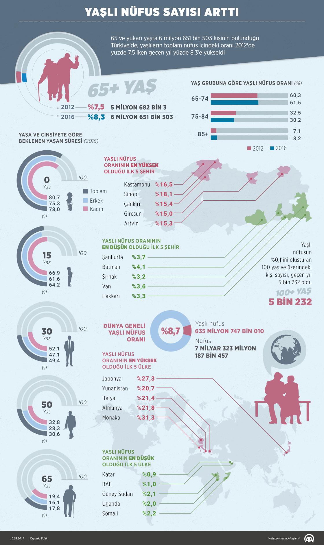 65 ve yukarı yaşta 6 milyon 651 bin 503 kişinin bulunduğu Türkiye'de, yaşlıların toplam nüfus içindeki oranı 2012'de yüzde 7,5 iken geçen yıl yüzde 8,3’e yükseldi. ( Murat Usubaliev - Anadolu Ajansı )