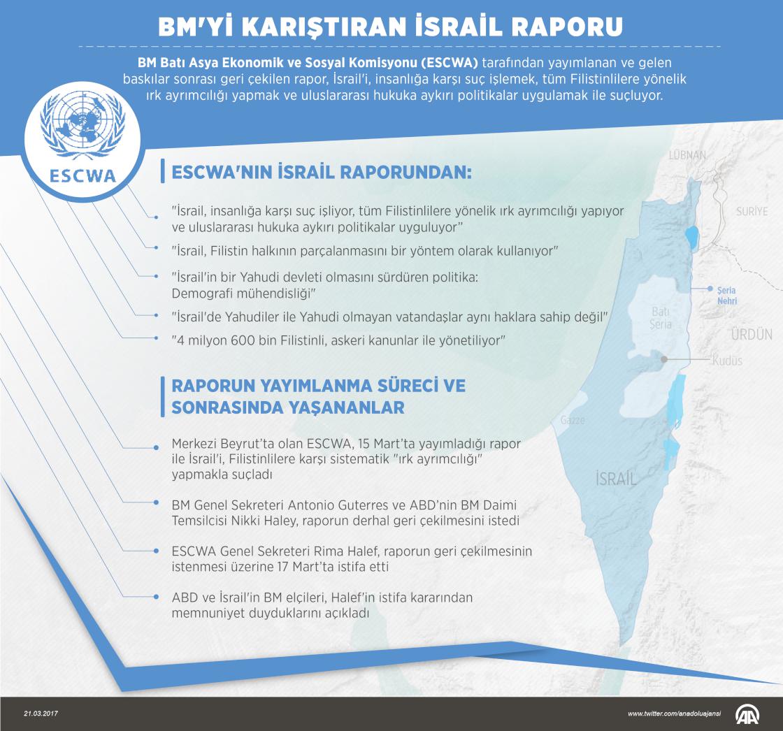 Birleşmiş Milletler Batı Asya Ekonomik ve Sosyal Komisyonu (ESCWA) tarafından yayımlanan ve gelen baskılar sonrası ESCWA Genel Sekreteri Rima Halef'in istifasıyla geri çekilen rapor, İsrail'i, insanlığa karşı suç işlemek, tüm Filistinlilere yönelik ırk ayrımcılığı yapmak ve uluslararası hukuka aykırı politikalar uygulamak ile itham ediyor. ( Gözde Gültekinler - Anadolu Ajansı )21 Mart 2017•Güncelleme: 21 Mart 2017