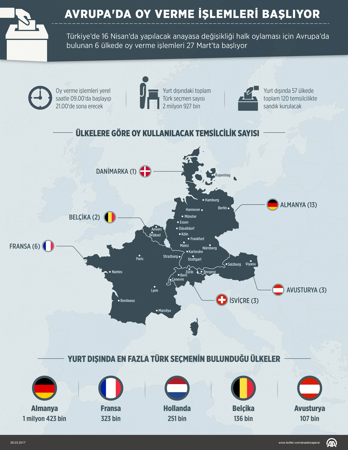 Cumhurbaşkanlığı hükümet sistemi halk oylaması için Almanya, Fransa, Belçika, İsviçre, Avusturya ve Danimarka'da yaşayan Türk vatandaşları yarından itibaren sandığa gidebilecek.