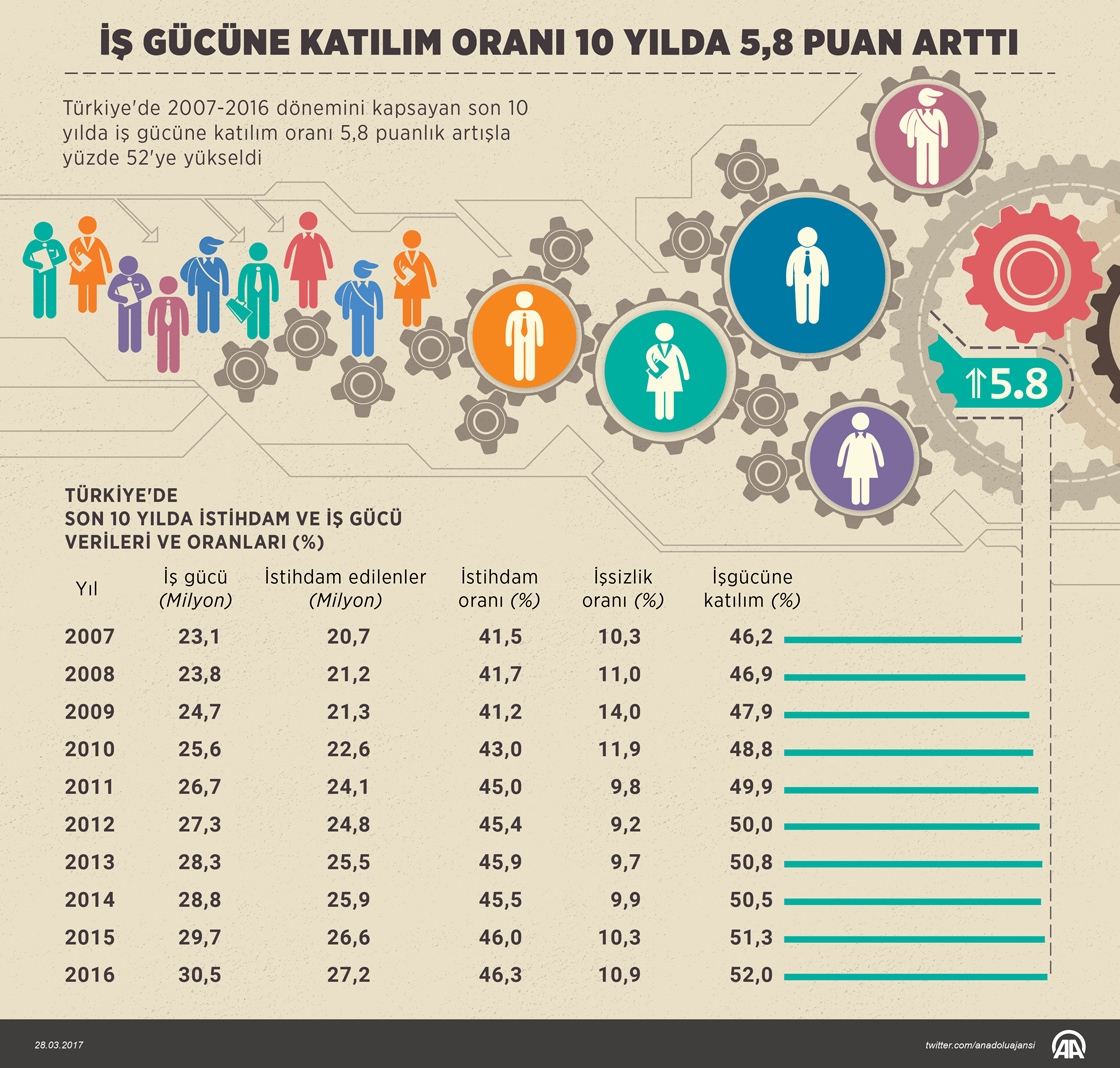 Türkiye'de 2007-2016 dönemini kapsayan son 10 yılda iş gücüne katılım oranı 5,8 puanlık artışla, yüzde 52'ye çıktı. ( Murat Usubaliev - Anadolu Ajansı )