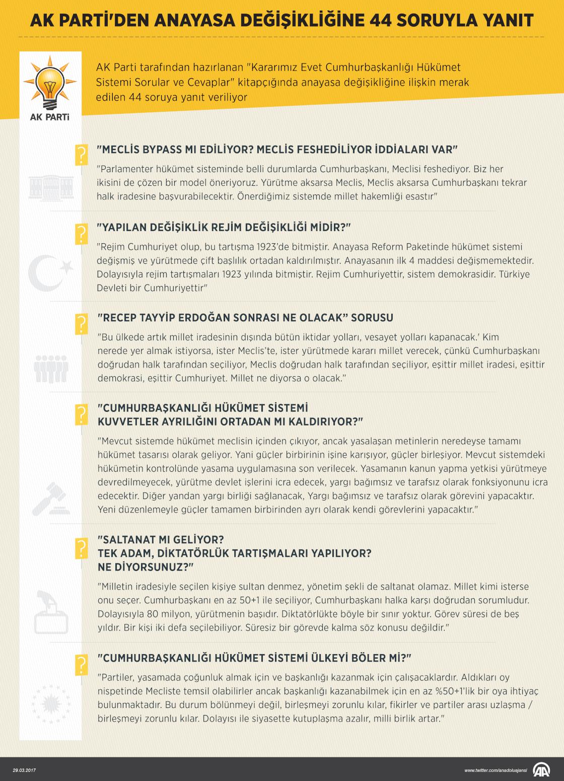 AK Parti tarafından hazırlanan "Kararımız Evet Cumhurbaşkanlığı Hükümet Sistemi Sorular ve Cevaplar" kitapçığında anayasa değişikliğine ilişkin merak edilen 44 soruya yanıt veriliyor. ( Yasin Demirci - Anadolu Ajansı )