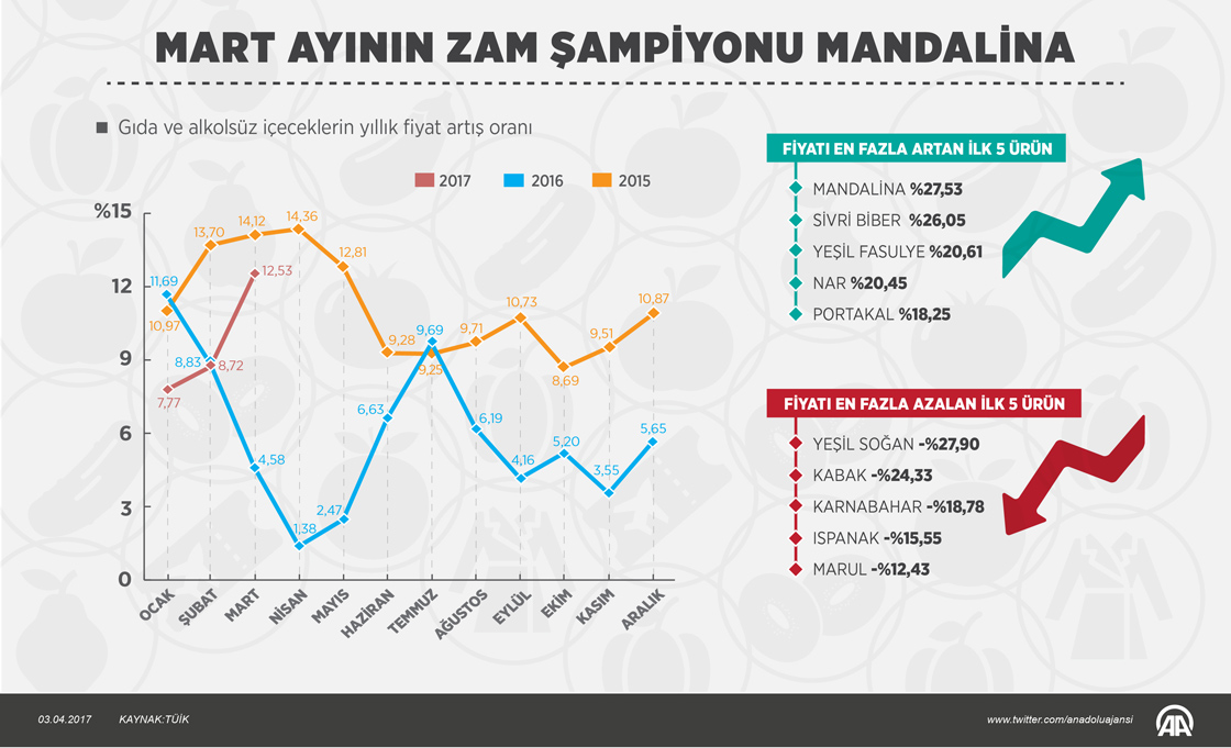 Tüketici fiyatları bazında martta en yüksek fiyat artışı yüzde 27,53 ile mandalinada oldu. Türkiye İstatistik Kurumu (TÜİK) verilerine göre, mandalinadaki fiyat artışını, yüzde 26,05 ile sivri biber, yüzde 20,61 ile yeşil fasulye izledi. ( Gözde Gültekinler - Anadolu Ajansı )03 Nisan 2017•Güncelleme: 03 Nisan 2017