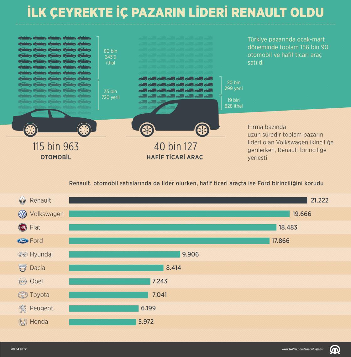 Ocak-mart döneminde satılan 156 bin 90 otomobil ve hafif ticari aracın 100 bin 71'ini ithal, 56 bin 19'unu yerli üretimler oluşturdu. Firma bazında uzun süredir toplam pazarın lideri olan Volkswagen ikinciliğe gerilerken, Renault birinciliğe yerleşti. Renault, otomobil satışlarında da zirvede yer aldı, hafif ticari araçta ise Ford birinciliğini korudu. ( Yasin Demirci - Anadolu Ajansı )06 Nisan 2017•Güncelleme: 06 Nisan 2017