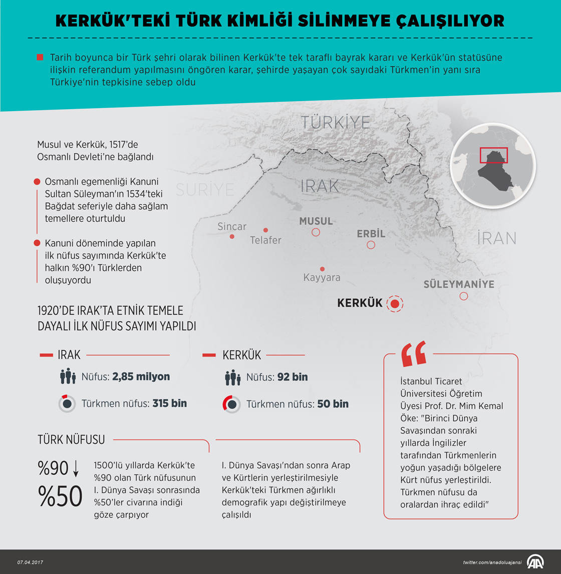 Irak'ın petrol zengini Kerkük şehrinde bayrak asma kriziyle başlayan ve İl Meclisinin referandum kararıyla devam eden sorun, Kerkük'ün durumu hakkındaki tartışmaları alevlendirdi. Osmanlı döneminde pekişen Kerkük'teki Türk varlığı ve nüfusu özellikle Birinci Dünya Savaşı'ndan sonraki yıllarda Arap ve Kürtlerin bölgeye yerleştirilmesiyle azalmaya başladı. Kerkük’ün 1920 yılında yapılan sayımda 92 bin civarındaki nüfusunun 50 bini Türklerden oluşuyordu. ( Ahmet Burak Özkan - Anadolu Ajansı )07 Nisan 2017•Güncelleme: 07 Nisan 2017