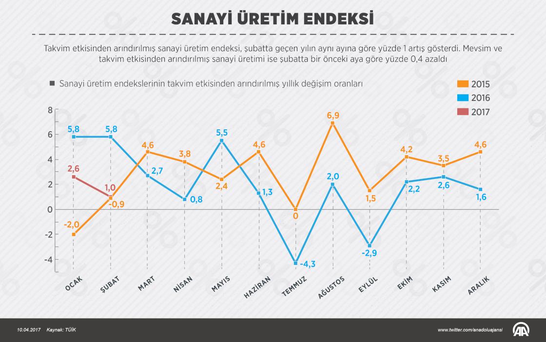 Takvim etkisinden arındırılmış sanayi üretim endeksi, şubatta geçen yılın aynı ayına göre yüzde 1 artış gösterdi. Mevsim ve takvim etkisinden arındırılmış sanayi üretimi ise şubatta bir önceki aya göre yüzde 0,4 azaldı. ( Murat Usubaliev - Anadolu Ajansı )