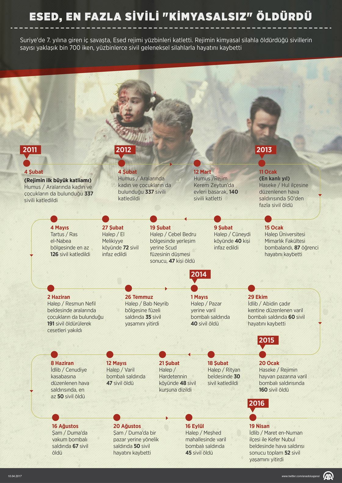 Suriye'de 7. yılına giren iç savaşta, Esed rejimi yüzbinleri katletti. Rejimin kimyasal silahla öldürdüğü sivillerin sayısı yaklaşık bin 630 iken, yüzbinlerce sivil geleneksel silahlarla hayatını kaybetti. Esed ilk büyük katliamını, 4 Ağustos 2011'de Hama'da, 130 barışçıl göstericiyi öldürerek yaptı. Rejim ordusu 4 Şubat 2012'de Mevlit Kandili gecesi Humus'ta 337 sivili katletti. Şebbiha milisleri, Halep ve Humus'ta evleri basarak, yüzlerce sivili kurşuna dizdi ve bıçakla infaz etti. İdlib, Halep ve Şam'da pazar yerlerine atılan vakum ve varil bombaları her seferde yüzlerce can aldı. ( Muhammed Ali Yiğit - Anadolu Ajansı )10 Nisan 2017•Güncelleme: 10 Nisan 2017