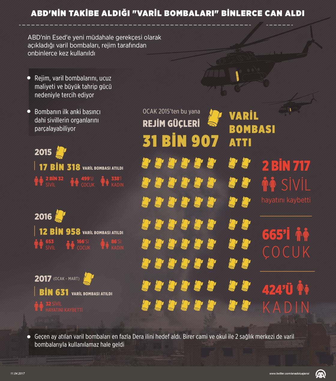 ABD yönetiminin, Suriye'de Beşşar Esed rejimine yeni müdahale gerekçesi olarak açıkladığı "varil bombası" kullanımı, rejimin 6 yıldır sivil yerleşimleri tahrip etmek için en fazla başvurduğu yöntemlerden biri olarak dikkati çekiyor. Rejim, varil bombalarını, ucuz maliyeti ve büyük tahrip gücü nedeniyle tercih ediyor. Bombanın ilk anki basıncı dahi sivillerin organlarını parçalayabiliyor. Son iki senede varil bombaları 665'i çocuk, 2 bin 685 sivilin canını aldı. ( Ahmet Burak Özkan - Anadolu Ajansı )11 Nisan 2017•Güncelleme: 11 Nisan 2017